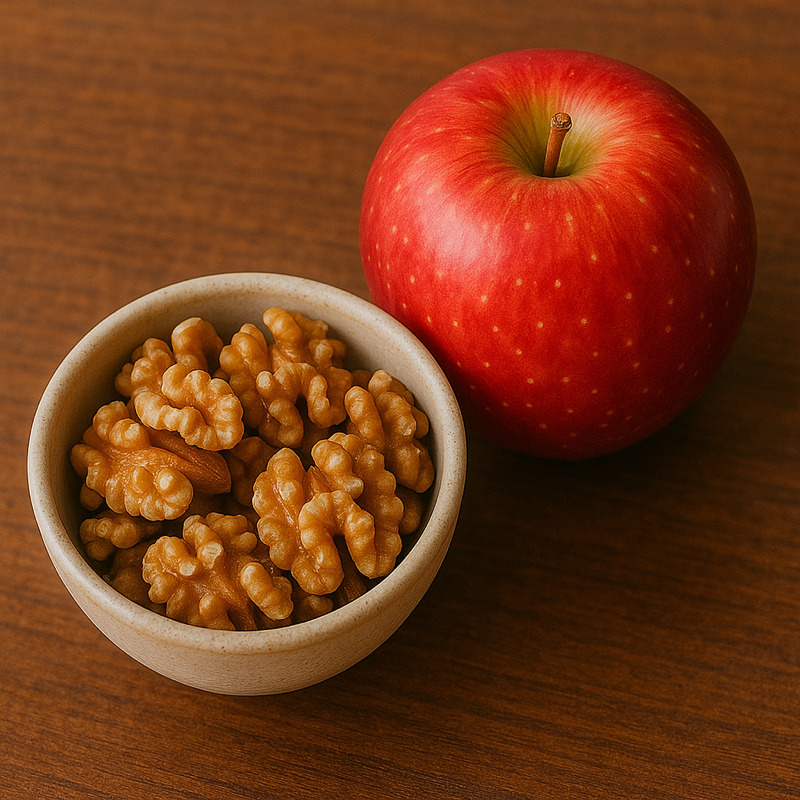 Ingrediënten: 1 handje walnoten, 1 appel.