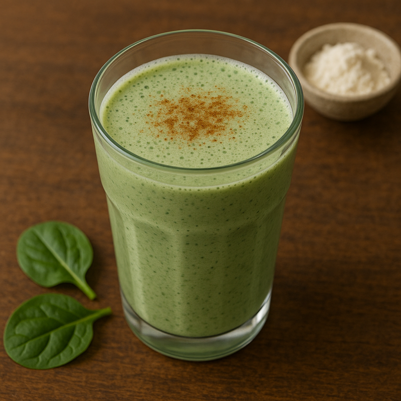 Ingrediënten: 1 schep eiwitpoeder, 1 kopje ongezoete amandelmelk, 1 handje verse spinazie, optioneel: ijsblokjes en kaneel naar smaak.