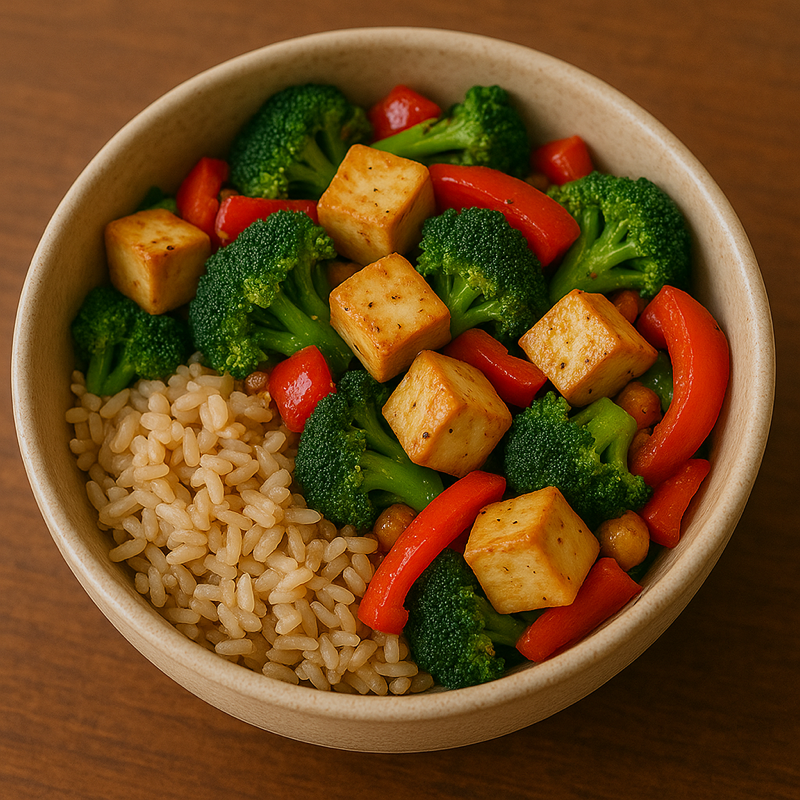 Ingrediënten: 150 g tofu (in blokjes), 1 kop broccoli, 1/2 rode paprika, 1/2 kop gekookte bruine rijst, 1 eetlepel sojasaus, 1 eetlepel olijfolie.