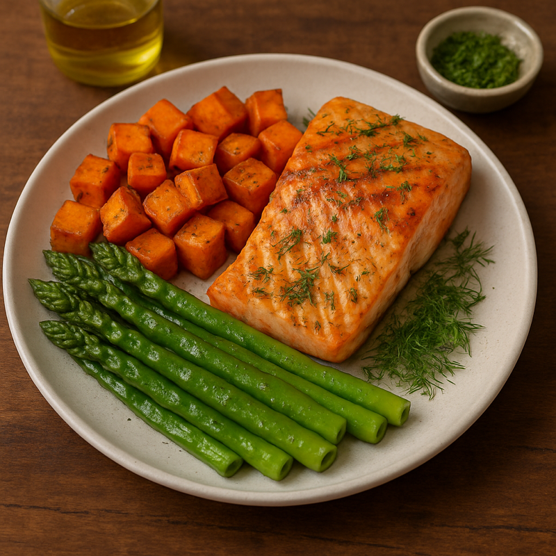 Ingrediënten: 150 g zalmfilet, 1 middelgrote zoete aardappel, 6-8 asperges, 1 eetlepel olijfolie, verse dille, peper en zout naar smaak.