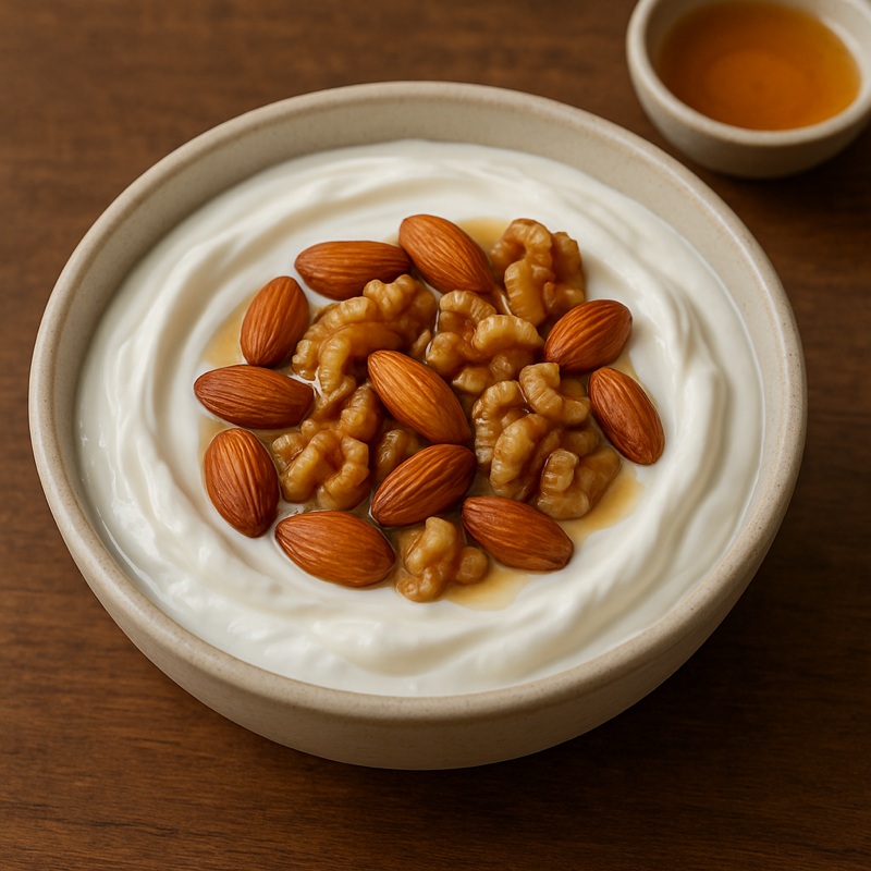 Ingrediënten: 200 g Griekse yoghurt, 1 handje amandelen of walnoten, optioneel: honing of vers fruit voor extra smaak.