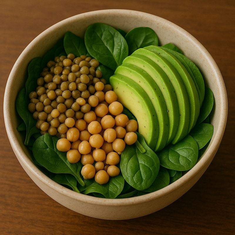 Ingrediënten: 1/2 kop gekookte linzen, 1/2 kop gekookte kikkererwten, 1 kop verse spinazie, 1/2 avocado (in plakjes), 1 eetlepel olijfolie, citroensap, zout en peper.