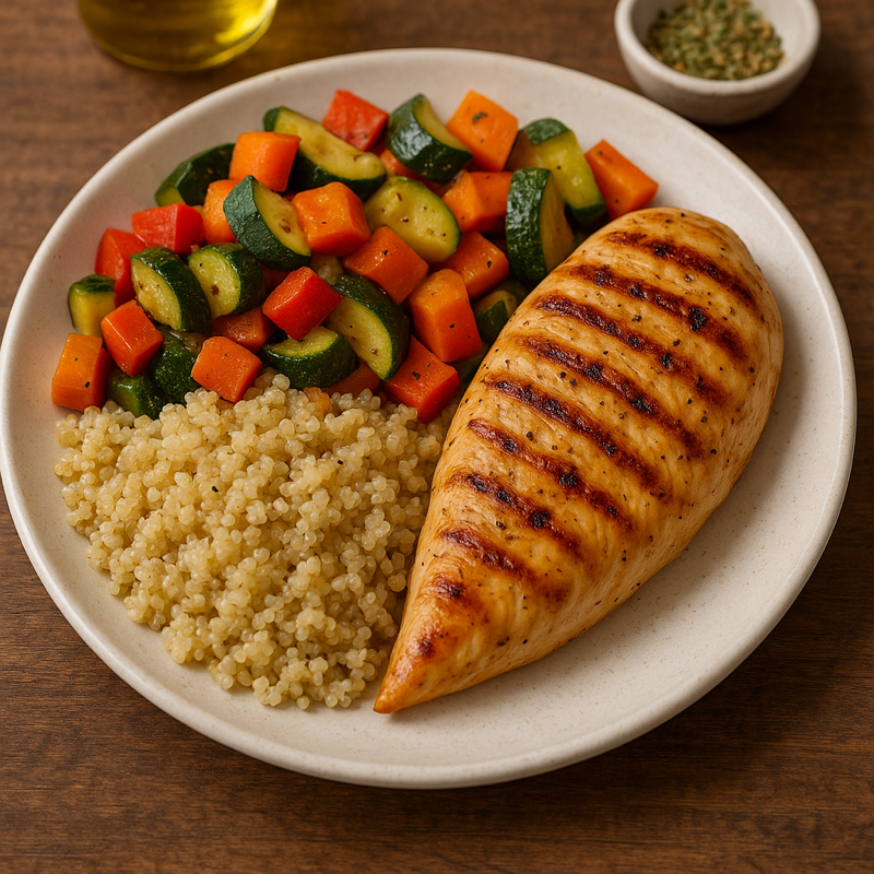 Ingrediënten: 150 g kipfilet, 1/2 kopje gekookte quinoa, 1 kop gemengde groenten (bijv. paprika, courgette, wortel), 1 eetlepel olijfolie, kruiden naar smaak.