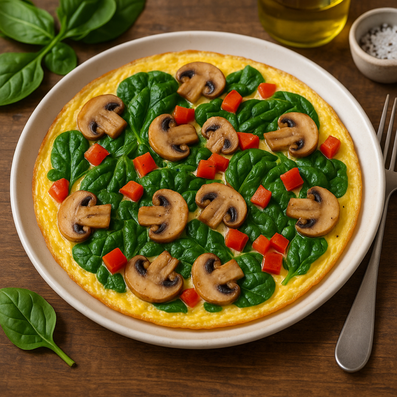 Ingrediënten: 3 eieren, 1 handje verse spinazie, 4-5 champignons (in plakjes), 1/2 rode paprika (in stukjes), 1 eetlepel olijfolie, peper en zout naar smaak.