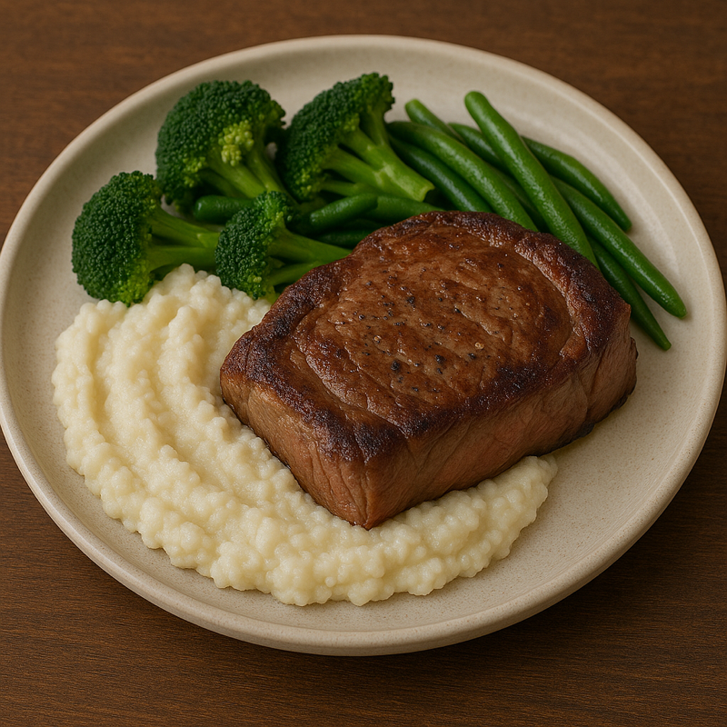 Ingrediënten: 150 g runderbiefstuk, 1/2 bloemkool (gepureerd), 1 kop broccoli of sperziebonen, 1 eetlepel olijfolie, peper en zout naar smaak.