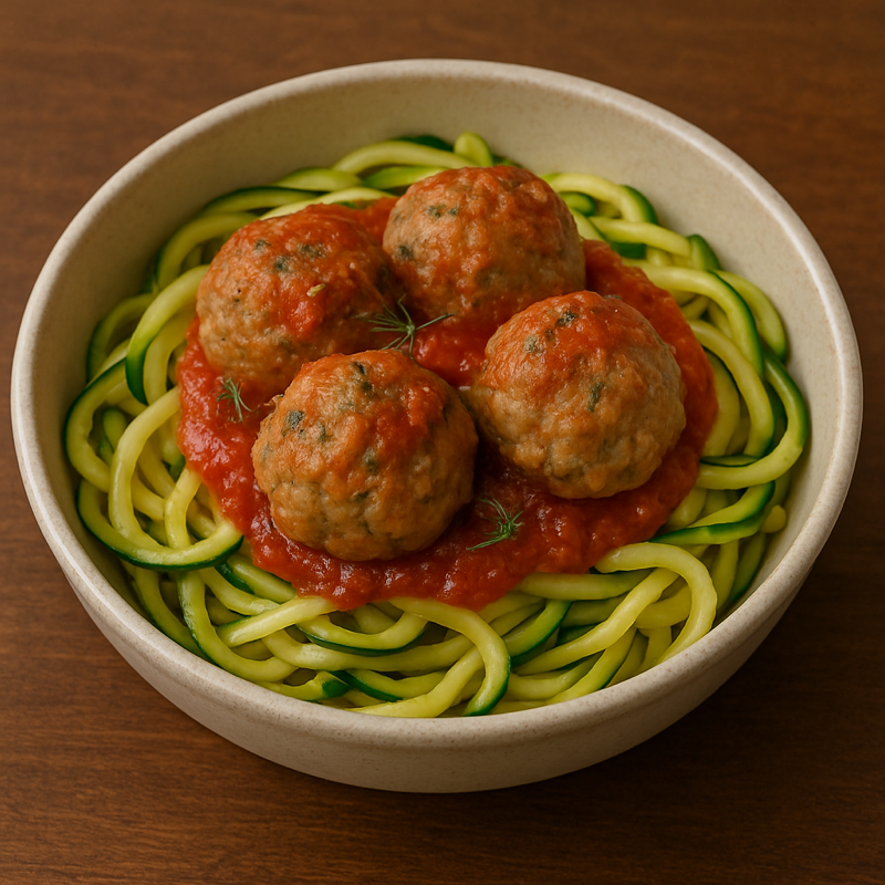 Ingrediënten: 1 grote courgette (geschaafd tot “pasta”), 150 g gemalen kalkoen, 1/4 kopje tomatensaus, Italiaanse kruiden, 1 eetlepel olijfolie, zout en peper naar smaak.